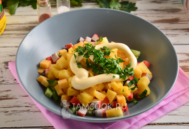 Для подачи в салат с крабовыми палочками, свежим ананасом и сыром можно добавить веточку свежей зелени.