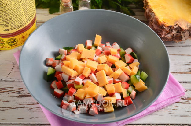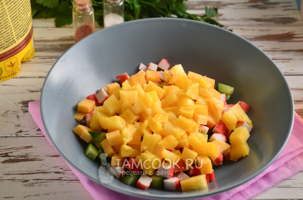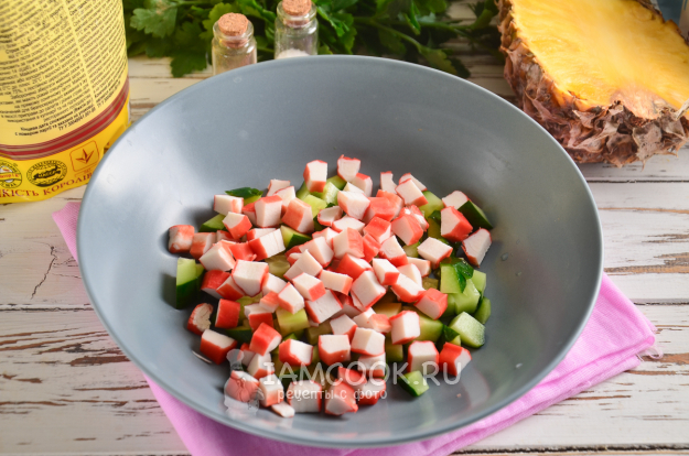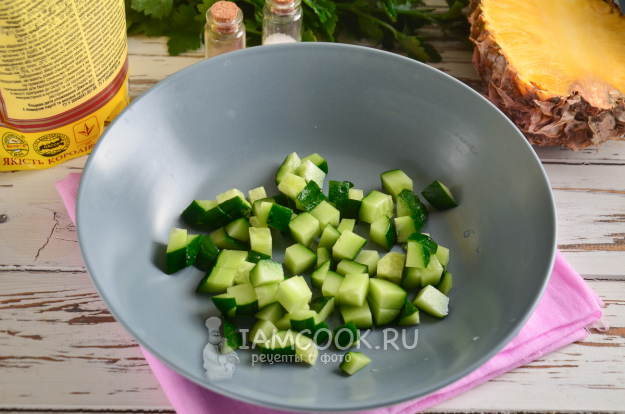 Кусочки ананаса нарежьте кубиками и положите в салатник.