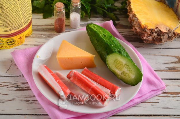 Подготовим необходимые продукты для салата с крабовыми палочками, свежим ананасом и сыром. Крабовые палочки заранее достаньте из морозилки, чтобы они оттаяли. Свежий огурец помойте. Отмерьте нужное количество сыра.