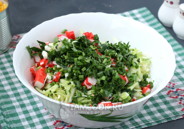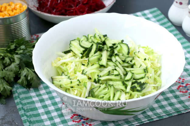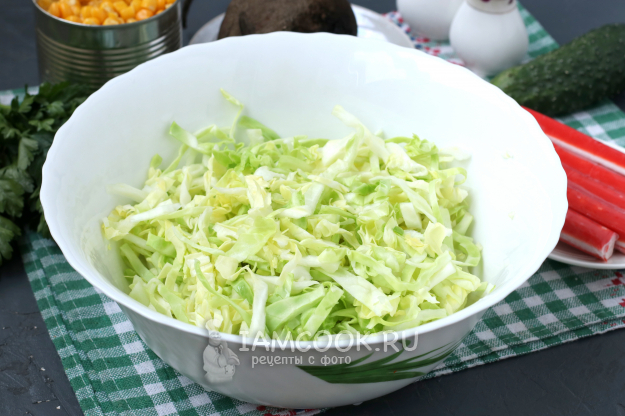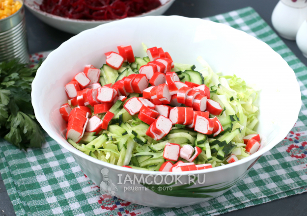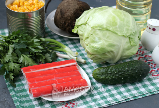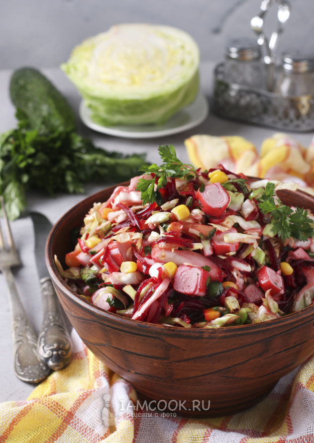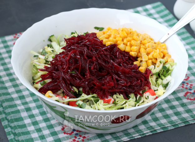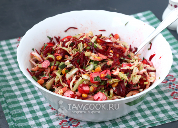 Крабовый салат с молодой капустой, кукурузой и отварной свеклой богат витаминами и яркими красками. Заранее нужно только сварить свеклу, что значительно ускорит приготовление салата.
