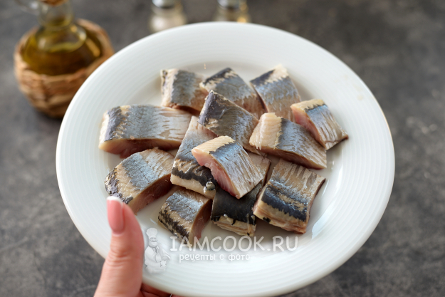 А пока почистите селедку, нарежьте ее на небольшие ломтики.