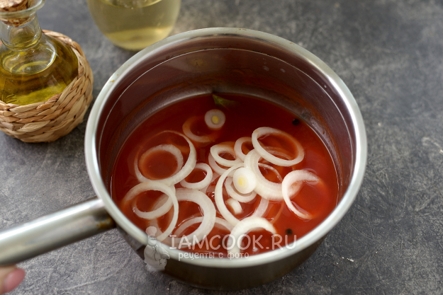 Поставьте сотейник на огонь, доведите до кипения, всыпьте соль и сахар, добавьте любимый томатный соус или кетчуп хорошего качества, влейте уксус. Можно также добавить немного острого перца или соуса типа табаско, с ним закуска заиграет совсем другими вкусовыми нотками. Дайте маринаду снова закипеть, попробуйте на вкус, он будет в меру кисловат. Снимите сотейник с плиты.