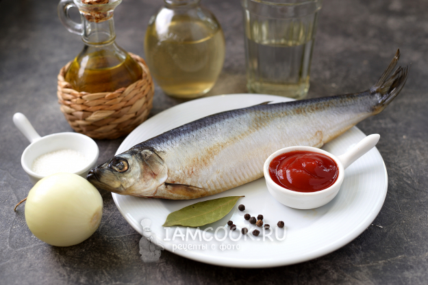 Подготовьте продукты для маринования селедки в томатном соусе в домашних условиях. Лук очистите, помойте.