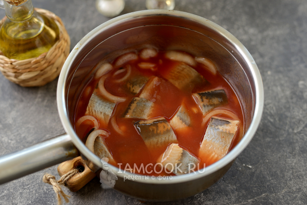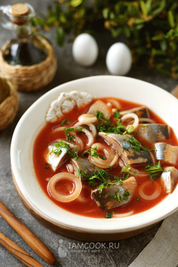 Спустя время вкуснейшая маринованная селедка в томатном соусе будет готова. Лук тоже получается невероятно вкусным, попробуйте при случае приготовить.