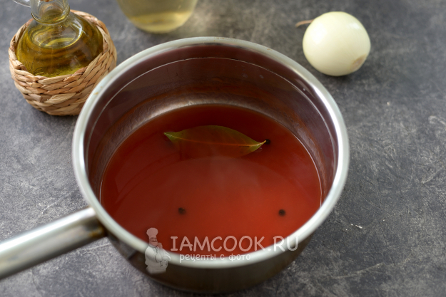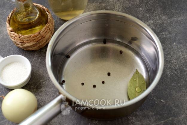Первым делом нужно приготовить маринад. Для этого нужно влить в сотейник воду, добавить лавровый лист и перец горошком.