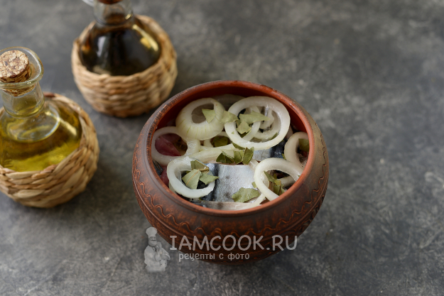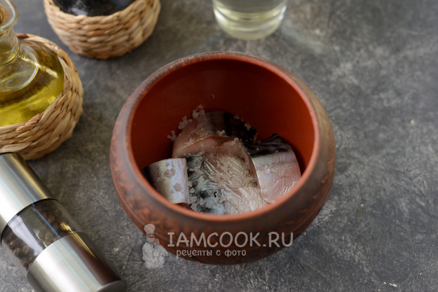 В любую удобную емкость выкладывайте слоями кусочки рыбы и кольца лука. Чуть присыпьте каждый слой рыбы солью с сахаром, молотым перцем и лавровым листом. Утрамбовывать содержимое горшочка не следует, так скумбрия быстрее приготовится.