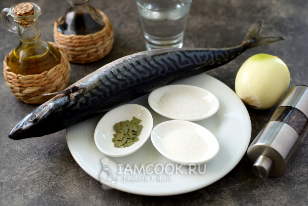 Подготовьте все необходимые продукты для сугудая из скумбрии. Лавровый лист слегка измельчите, рыбу чуть разморозьте, в подмороженном состоянии ее гораздо легче будет почистить. Лук очистите от шелухи, помойте. Соль я использовала морскую крупного помола, у меня ушла неполная столовая ложка на достаточно крупную рыбу.