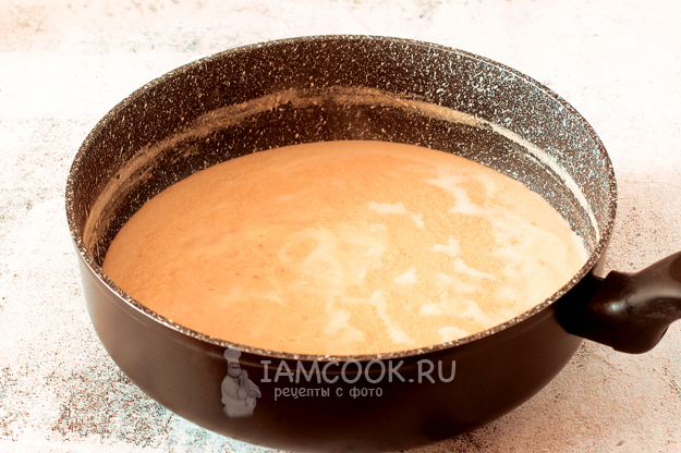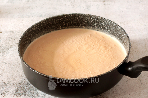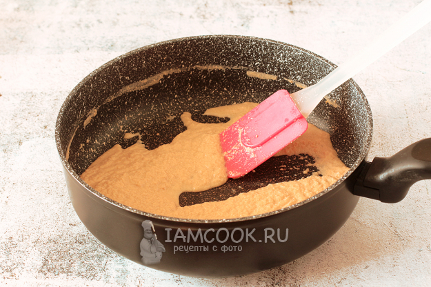 Вылейте ее в сковороду с толстым дном и с антипригарным покрытием, поставьте на сильный огонь.