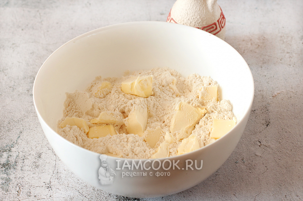 Порубите в нее сливочное масло и хорошенько все перетрите до равномерной крошки.