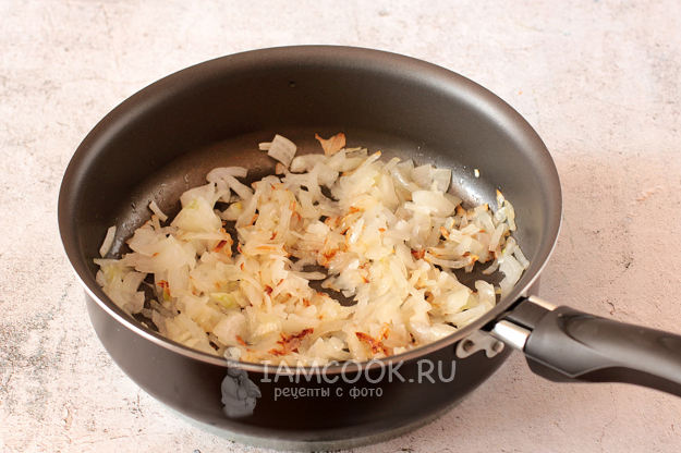 В небольшом количестве растительного масла обжарьте лук до легкой золотинки.