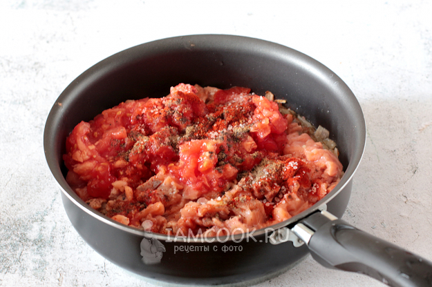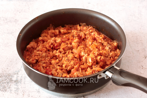 Добавьте мелко нарезанное филе рыбы и рубленые помидоры.
