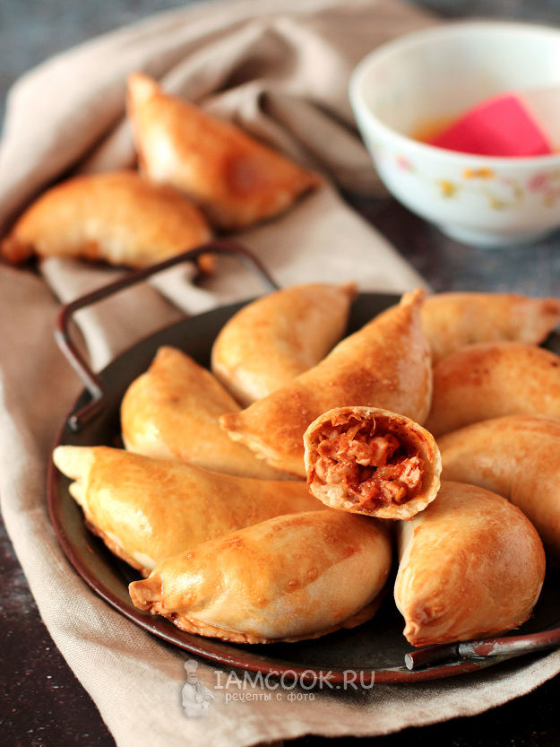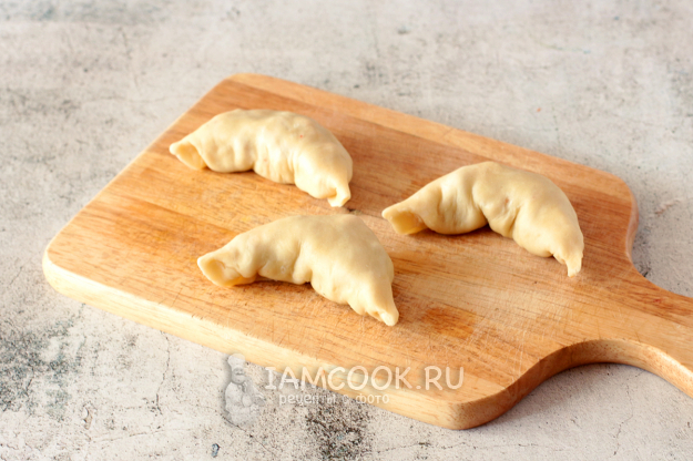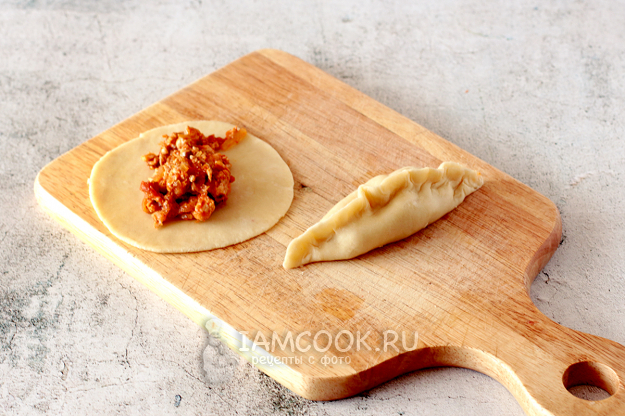 В центр лепешки выложите начинку и сформируйте пирожок, стараясь тщательно защипать его края.