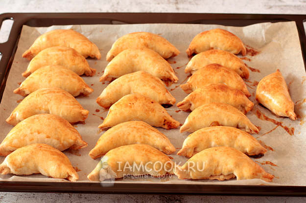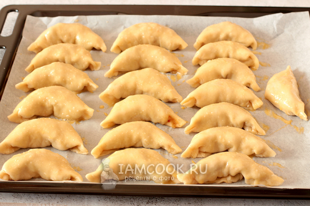 Выложите пирожки на противень с антипригарным пергаментом или просто слегка смажьте противень маслом.