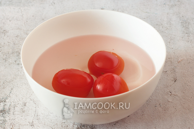 Сначала освободите помидоры от кожицы. Для этого сделайте надрезы крест-накрест и залейте помидоры кипятком.