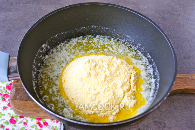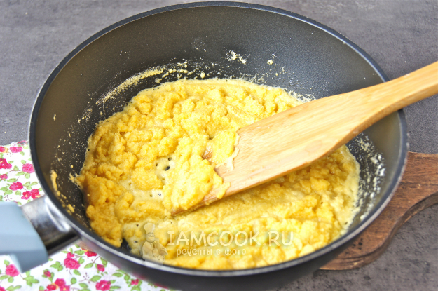 Частями всыпьте кукурузную муку и, помешивая деревянной лопаткой, прогревайте на умеренном огне. Сначала масса загустеет, но затем станет более жидкой - так и должно быть. Мешать нужно постоянно, пока мука не приобретет золотистый цвет.