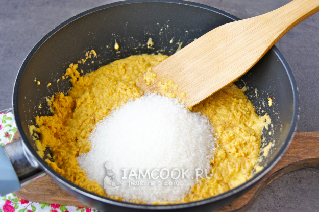 Снимите сковороду с огня, добавьте сразу весь сахар и тщательно мешайте деревянной лопаткой до полного растворения сахара.