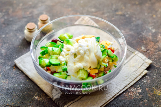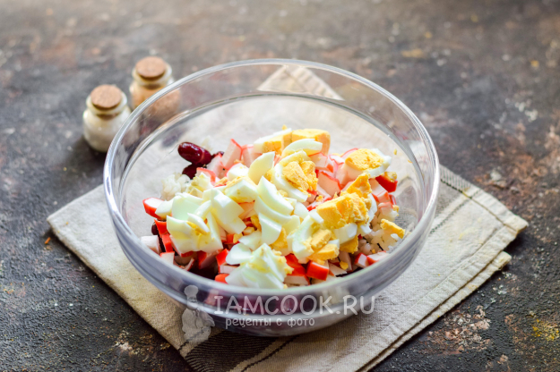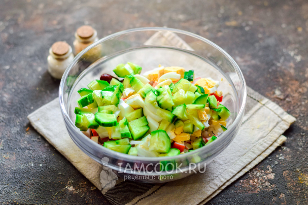 Куриное яйцо сварить вкрутую, очистить и нарезать небольшими кубиками. Добавить яйцо к остальным ингредиентам в салатнике.
