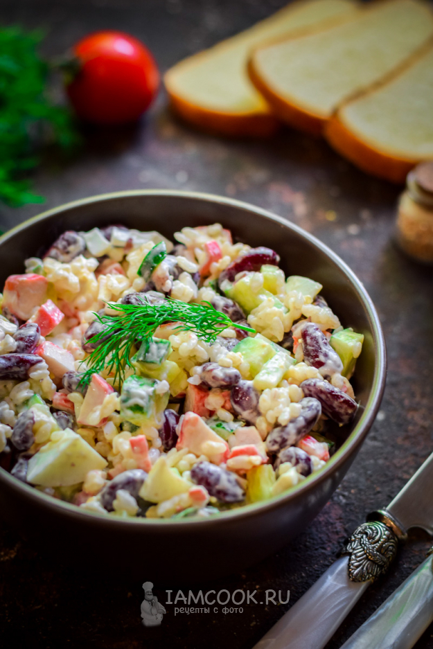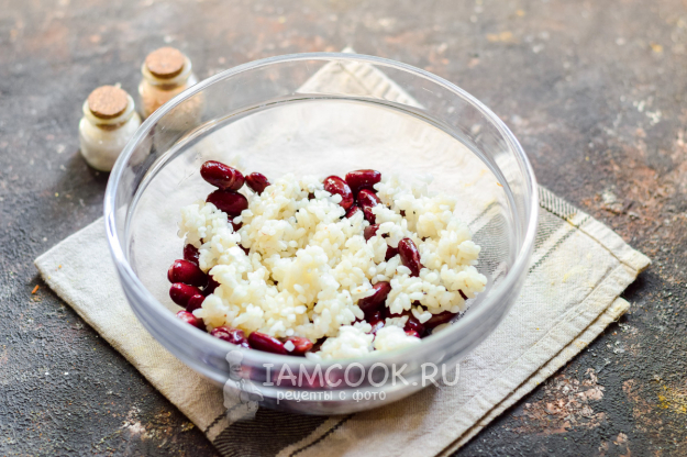 Рис заранее отварить до готовности, нам понадобится 100 граммов вареного риса (для оригинальности можно сварить его ВОТ ТАК или ТАК). Далее рис необходимо остудить до комнатной температуры и добавить в салатник к фасоли.