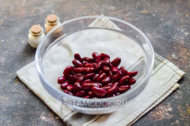 Консервированную красную фасоль промыть, откинуть на сито и дать стечь лишней жидкости. После чего переложить фасоль в салатник.