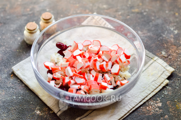 Подготовить все продукты, которые нужны для салата с фасолью, крабовыми палочками и рисом.