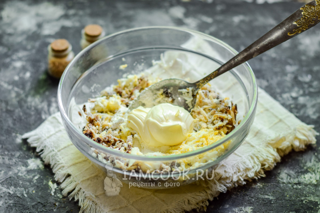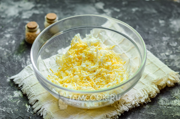 Куриные яйца отварить вкрутую - обычно 10 минут достаточно, после остудить и почистить. Натереть яйца на мелкой терке и переложить в глубокую миску.