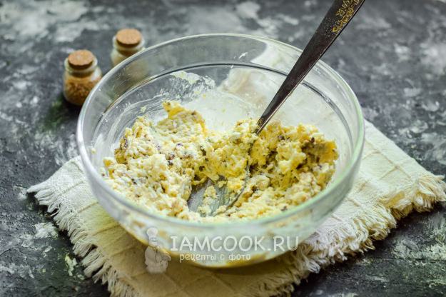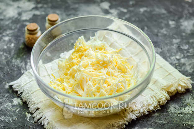 Плавленый сыр натереть на мелкой терке и добавить в миску к яйцам. Предварительно сырок можно оставить в морозильной камере на 10 минут, чтобы удобнее было натирать.