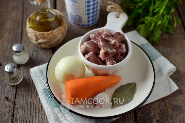 Для приготовления куриных сердечек в сметане в духовке нам понадобятся продукты из списка ингредиентов.