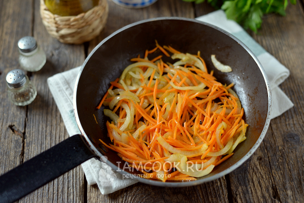 Разогрейте в сковороде немного постного рафинированного масла, обжарьте в нем нарезанный полукольцами лук и тонко нашинкованную морковь до мягкости.