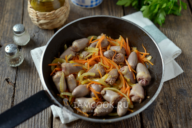 Выложите в сковороду сердечки, быстро обжарьте их, они должны слегка побелеть.
