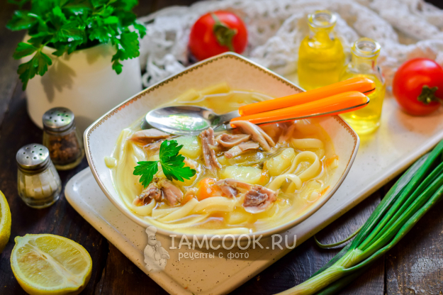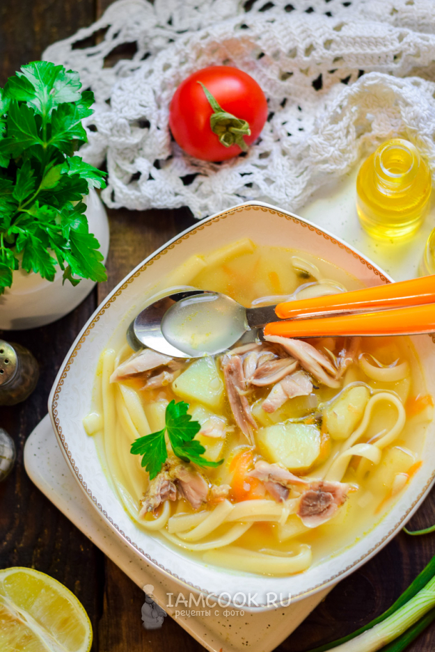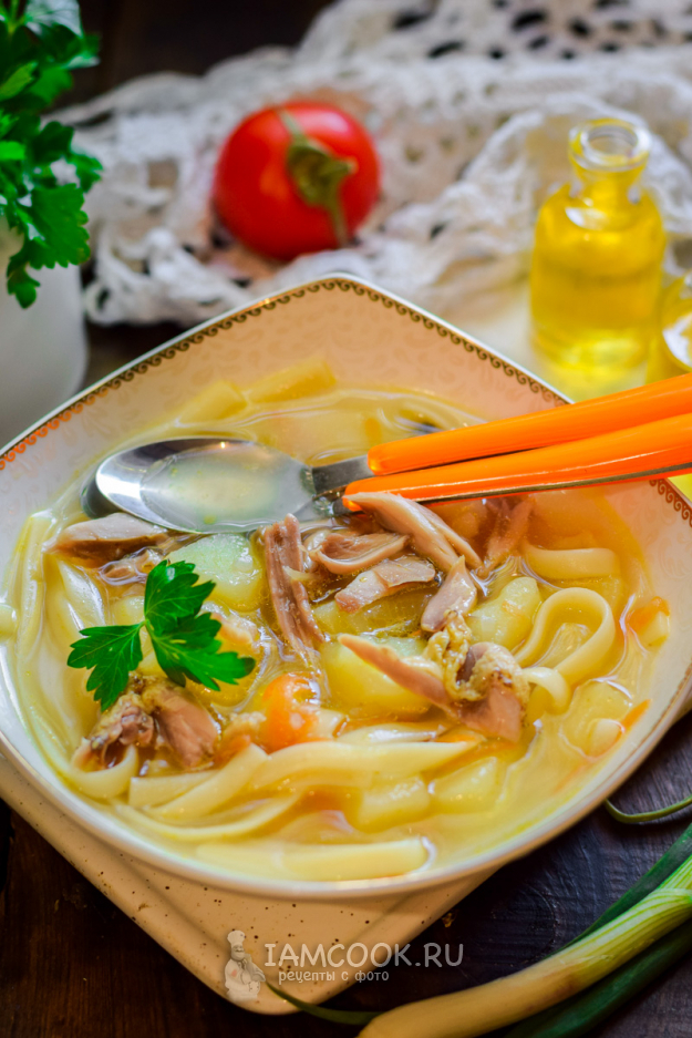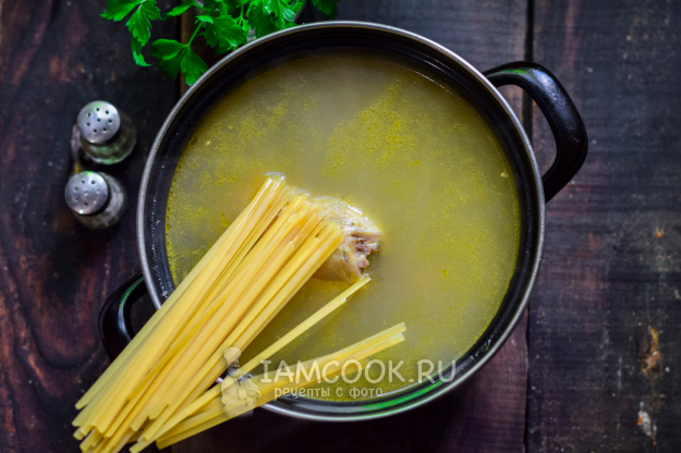 Добавить в кастрюлю лапшу, перемешать и варить 4-5 минут. Готовый суп подавать к столу.
