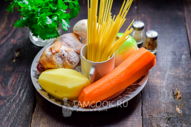 Подготовить все продукты для супа на перепелке с лапшой и грибами.