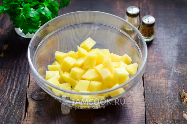 Очистить картофель, вымыть и просушить. Нарезать картошку кубиками.