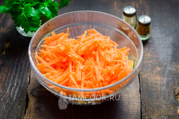 Морковь очистить и вымыть, просушить. Натереть на средней терке, добавить к картофелю.