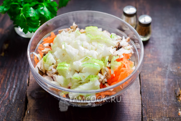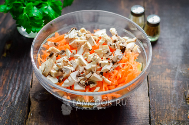 Шампиньоны вымыть и просушить, нарезать грибы маленькими кубиками.
