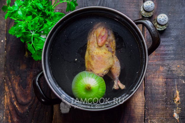 Взять кастрюлю, переложить в неё перепелку, добавить луковицу, влить воду. Варить мясной бульон 30 минут. Спустя время лук удалить.