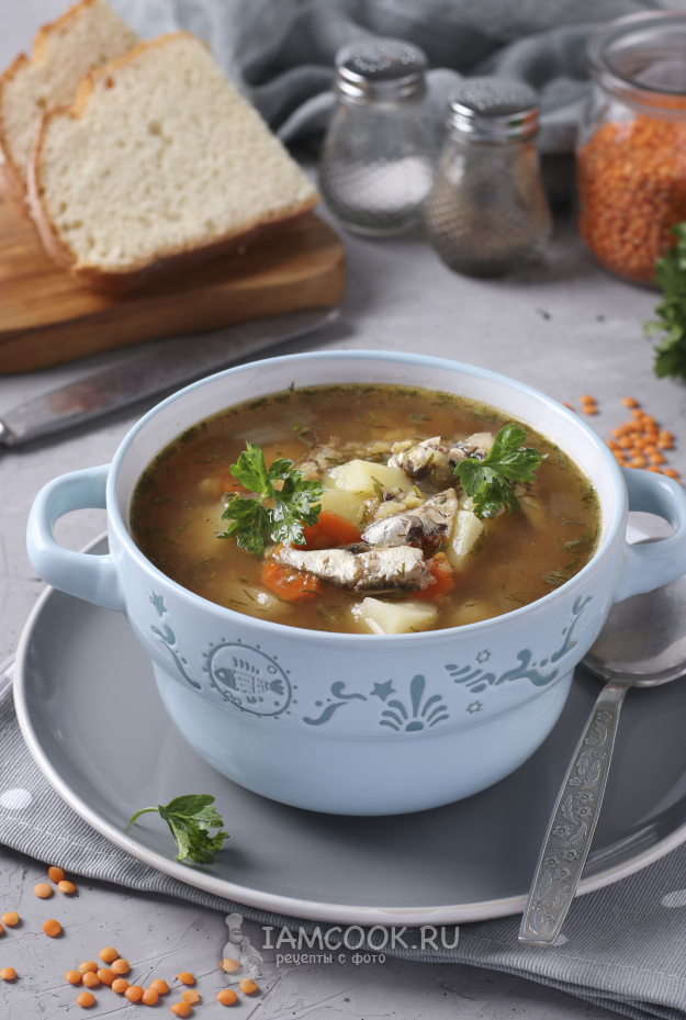Через 5 минут суп с килькой и чечевицей будет готов. Можно разливать в тарелки и подавать к столу.