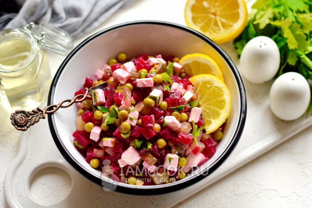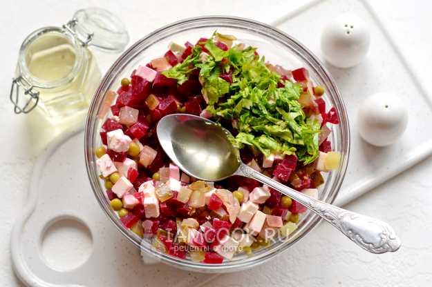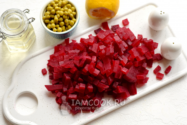 Свеклу отварите заранее в кожуре до готовности (а можно просто купить уже готовую свёклу в магазине). Примерное время варки составляет 60-90 минут, в зависимости от размера и сорта плода. После варки свеклу остудите, очистите, нарежьте одинаковыми кубиками среднего размера.