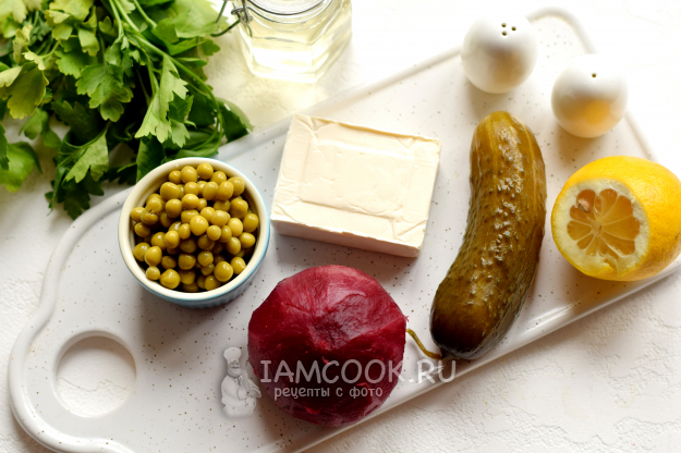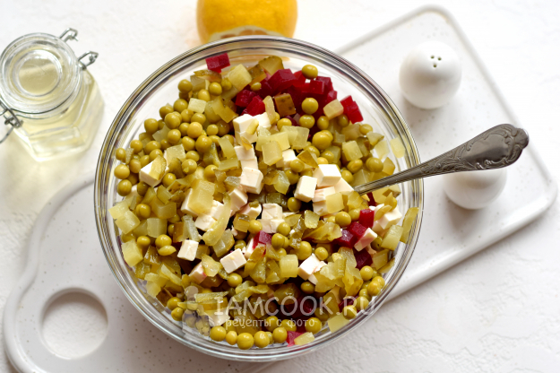 Нарезку свеклы, огурцов и сыра соедините в одной емкости, добавьте консервированный зеленый горошек, заранее слив весь маринад.