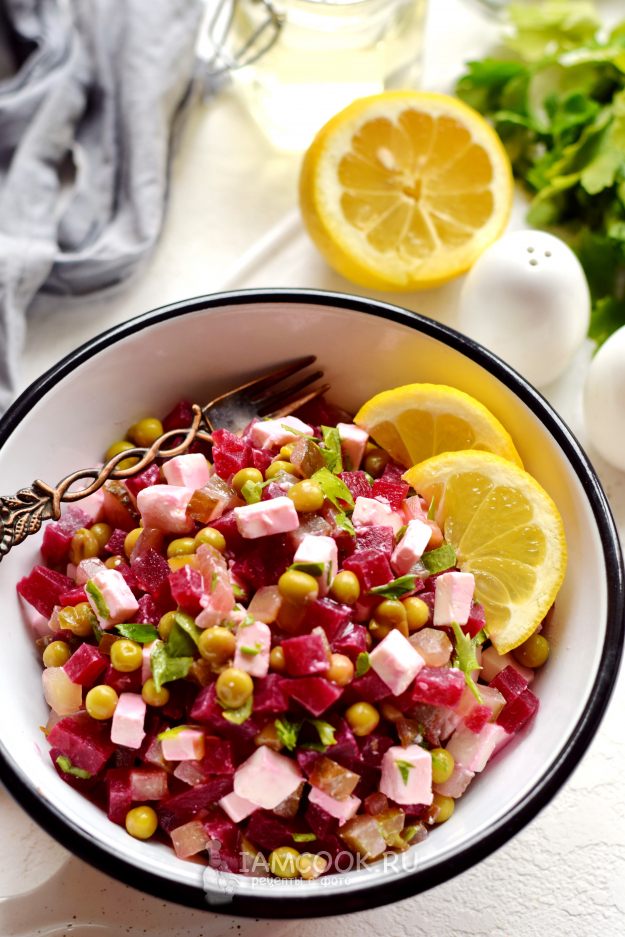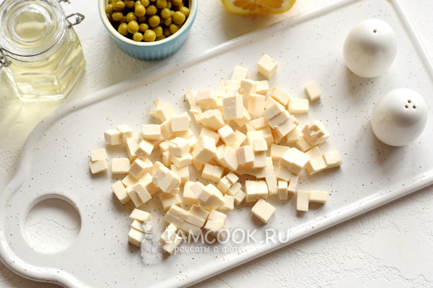 Плавленый сырок слегка подморозьте в морозильной камере, поскольку твердый продукт будет нарезаться легче и ровнее. Нарежьте сырок такими же кубиками, как и свеклу.