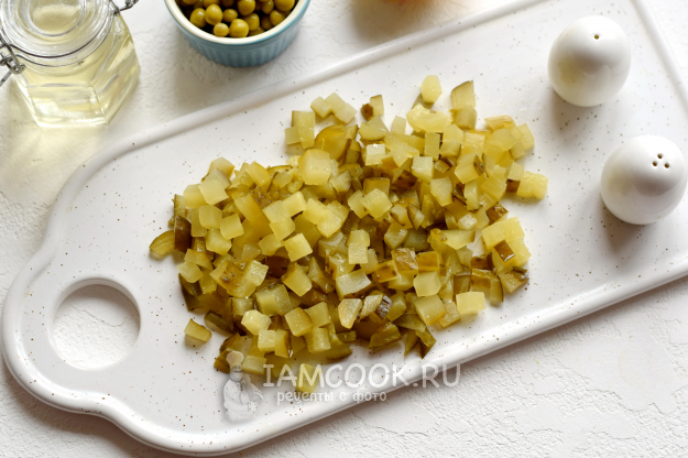 Соленые огурцы отожмите от рассола, нарежьте аналогично другим компонентам. Сок, который выделится при нарезке, слейте.