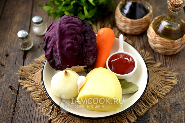 Подготовьте необходимые продукты для щей из красной капусты. Лук, чеснок, картофель, морковь очистите, помойте под проточной водой вместе с капустой и зеленью.