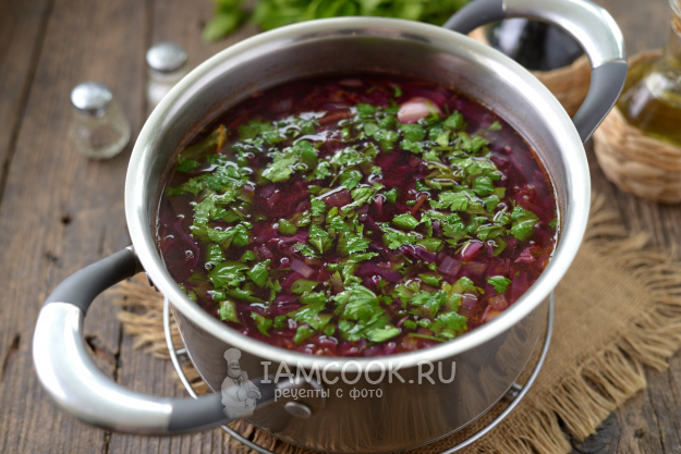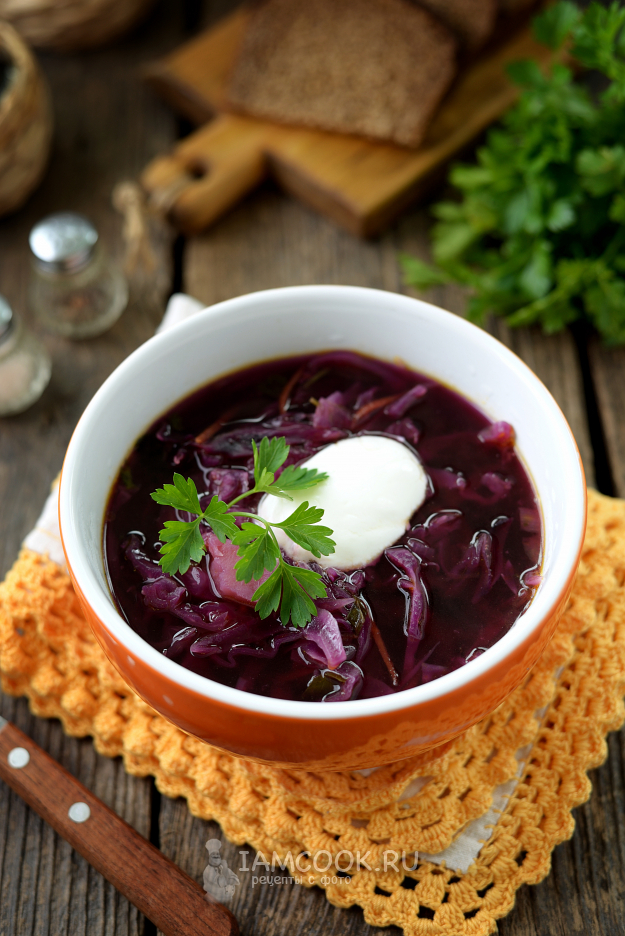 Щи из красной капусты готовы. Разлейте по тарелкам и подавайте к столу. Если вы приготовите такой суп не во время поста, тогда можно положить ложку сметаны.