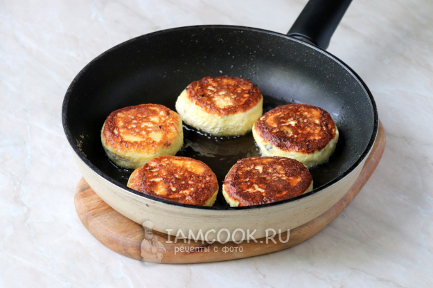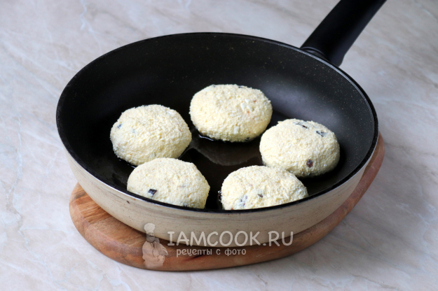 Смоченными в воде ладонями сформируем сырники и выложим на разогретую с растительным маслом сковороду.