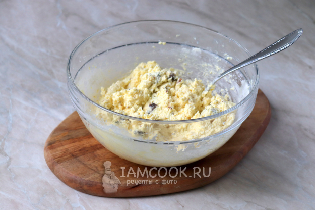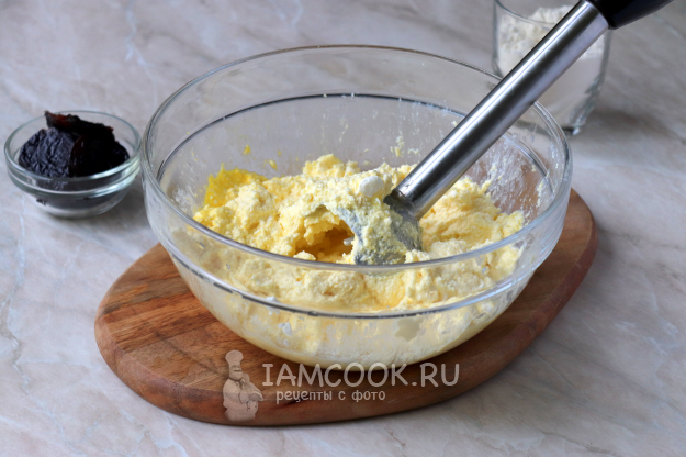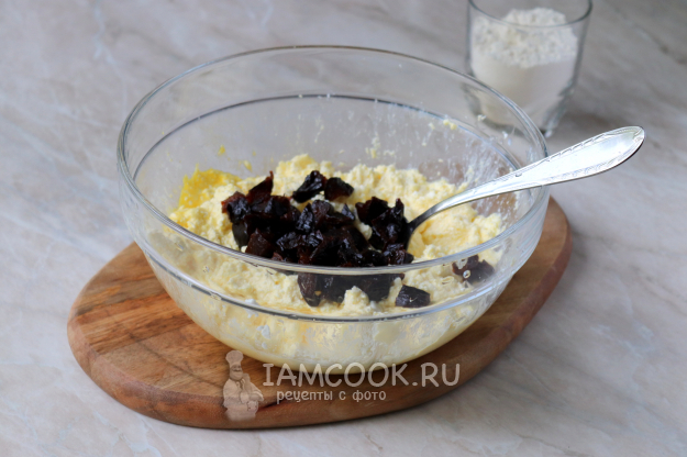 Чернослив нарежем небольшими кубиками и добавим в творожную массу. Я использовала вяленый чернослив. Если хотите, можете приобрести копчёный, но это на любителя.