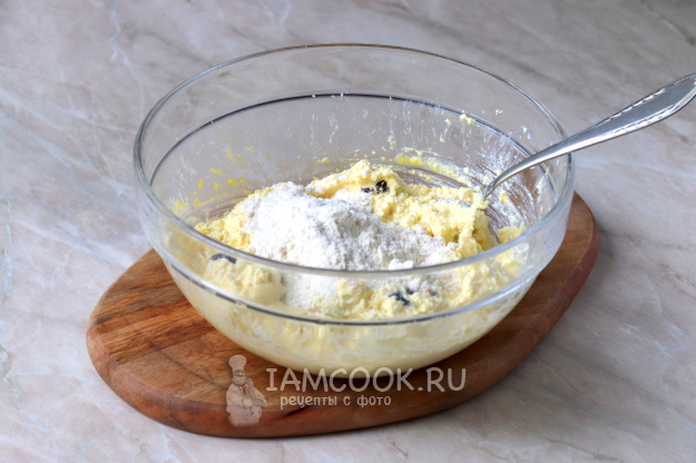 После чего введём просеянную пшеничную муку. Её количество будет зависеть от влажности творога и величины используемого яйца, поэтому ориентируйтесь по консистенции теста.