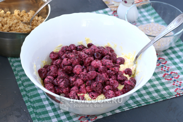 Смесь хорошо перемешать ложкой или пробить блендером, если хотите получить совсем однородную массу. Вишню пересыпать крахмалом и добавить в творожную массу, перемешать. Для замороженной вишни может понадобиться немного больше крахмала, чем для свежей.
