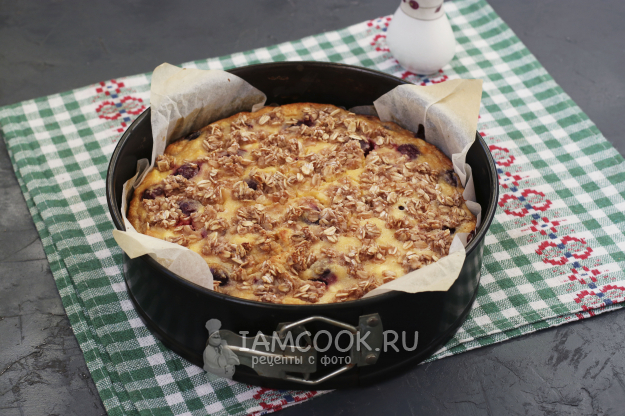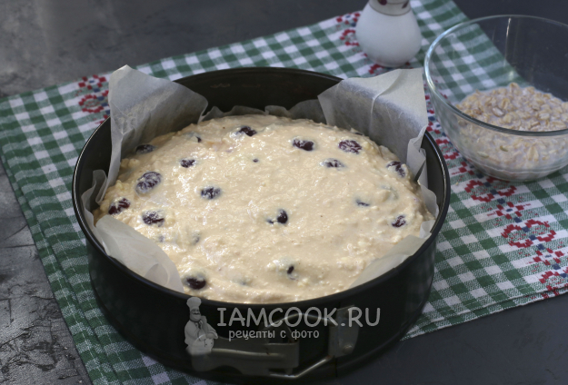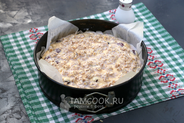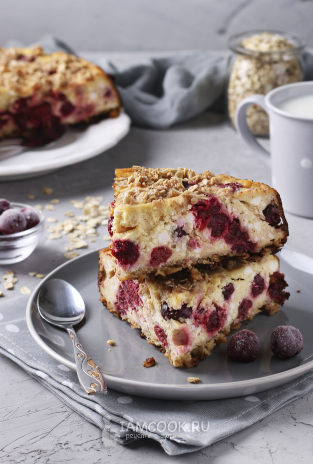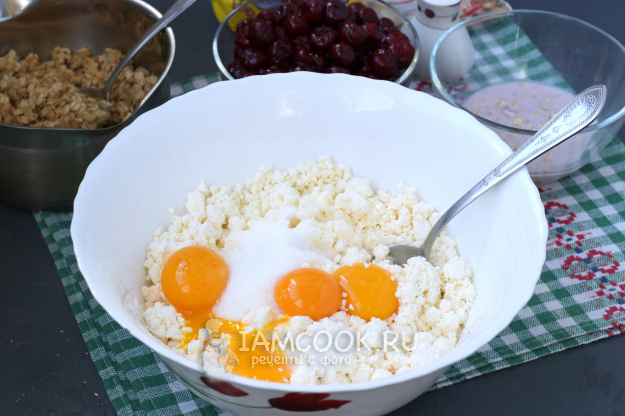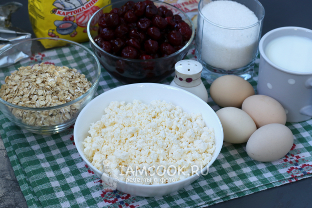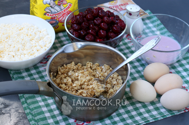 Подготовить по списку ингредиентов продукты для творожной запеканки с овсянкой и вишней.