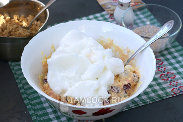 Отдельно взбить до пышности белки, добавить их к творожной массе и аккуратно перемешать.