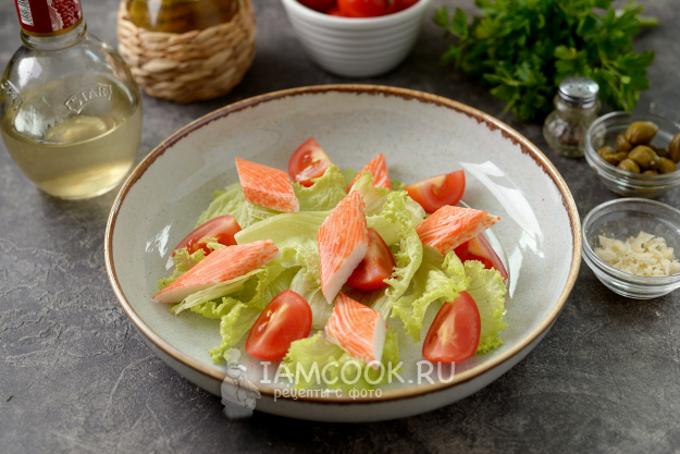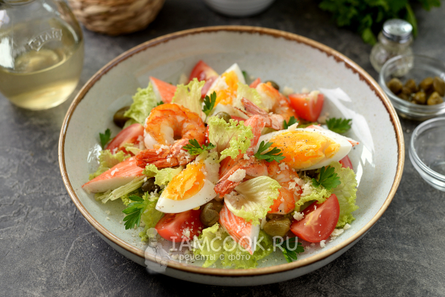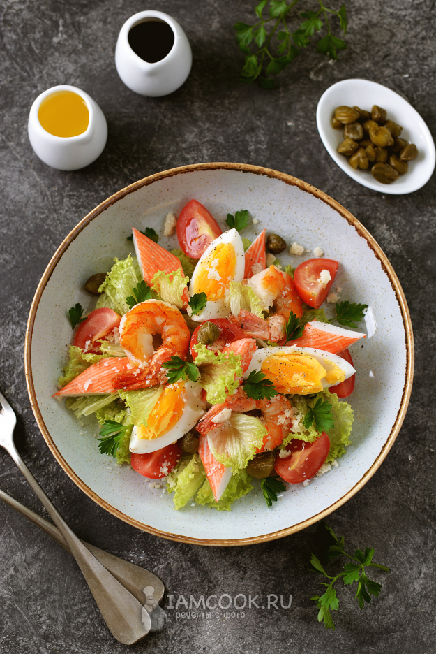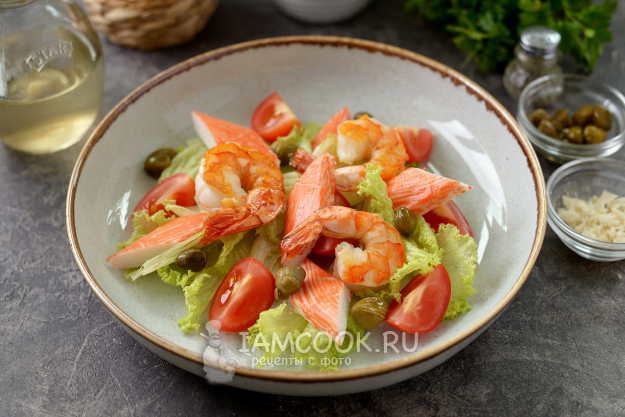 Салат из крабовых палочек и креветок с помидорами черри и каперсами готов. Подавайте к столу сразу после приготовления.