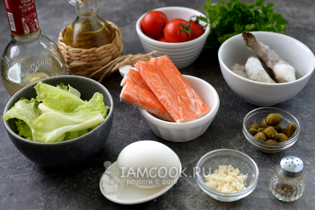 Подготовьте продукты для салата из крабовых палочек и креветок с помидорами черри и каперсами. Хвосты креветок разморозьте и помойте, обсушите овощи с травой, яйцо отварите минут 8, остудите, очистите.